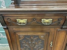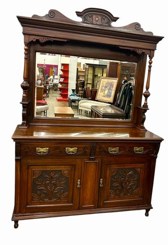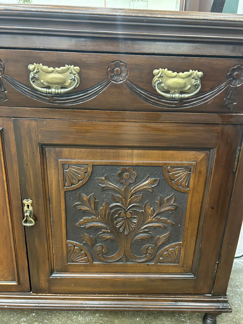 Late Victorian Early Edwardian Mahogany Sideboard w/Beveled Mirror, H. 86 in. x W. 60 in. x D.21.25 in. (as is, base molding damaged)