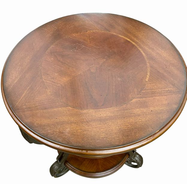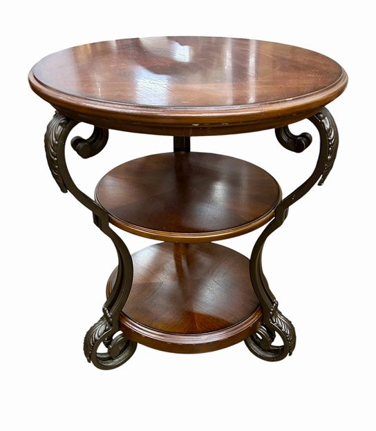 Classical Three Tier Round Wood & Scrolling Metal Side Table
