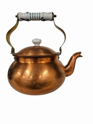 Vintage copper kettle w/ ceramic handle, 8.5" h, 6.25" diam.