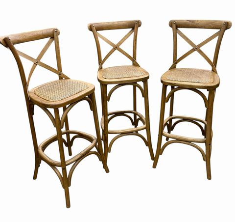 3 Oak & Rattan Bar Stools, H. 48.5 in. x W. 17.5 in. x D 17.5 in.