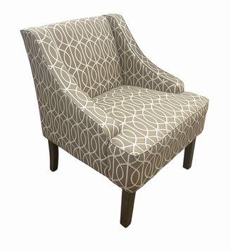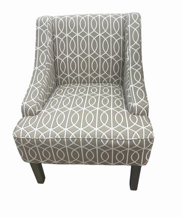 Classic gray swoop-arm accent chair w/ white trellis pattern, 34" x 24.75" x 20.5"