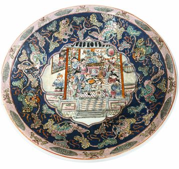 Large antique famille rose shallow porcelain bowl, 2.75" h, 14.25" diam.