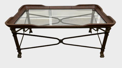 Maitland Smith Leather & Glass Coffee Table, H. 19.5 in. x L. 45.5 in. x W. 27.5 in.