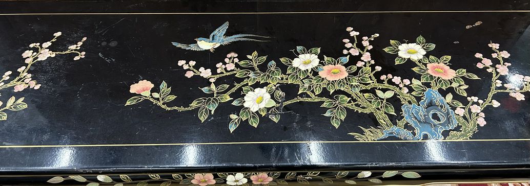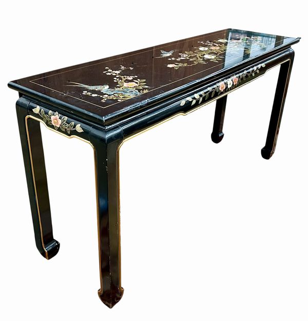 Vintage Chinese Black Lacquer Console Table w/ Chinoiserie Motifs, H. 36 in.