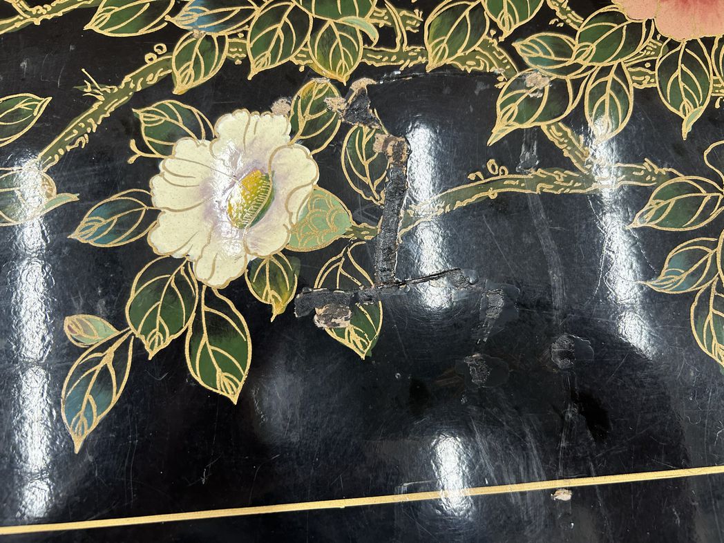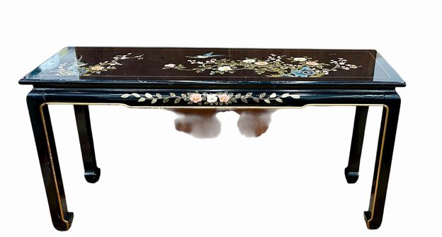 Vintage Chinese Black Lacquer Console Table w/ Chinoiserie Motifs, H. 36 in. x W. 24 in. x D. 16 in. (as is) Damage to lacquer top.