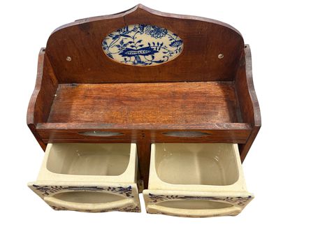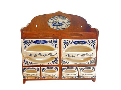 Vintage Delft spice cabinet w/ "Blue Onion" ceramic drawers, 13" h, 12.5" w, 5" d