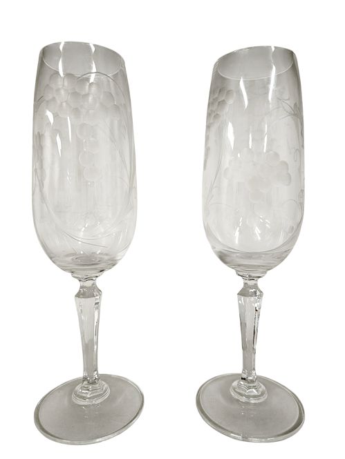 Pair Etched w grapes Crystal Champagne Flutes 8.5 x 2.5" dia