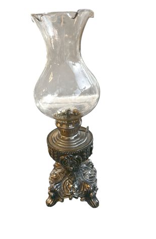 Oil-burning antique silverplate lamp from Hong Kong, 10" h, 3" w, 3" d