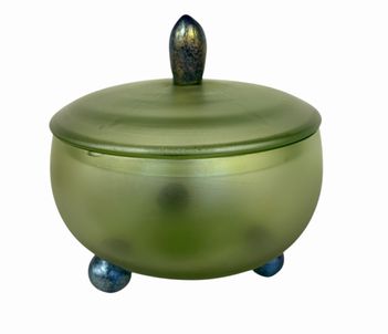 Art nouveau iridescent lidded glass powder box w/ ball feet Made by Johann Loetz