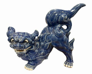 Blue glazed ceramic foo dog, 10" h, 10.25" w, 4.5" d