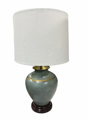 Mottled green porcelain lamp w/ gold band on wood base w/ cream shade, 21.5" h