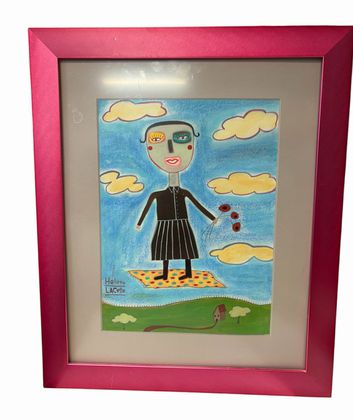 Framed original figural folk art painting, oil on board, by Canadian artist Hele