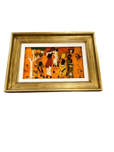 Gold Wood Frame African Batik Farm Scene 15"h x 29"w