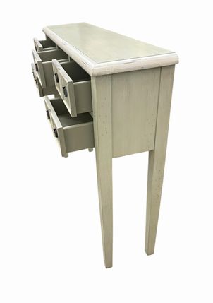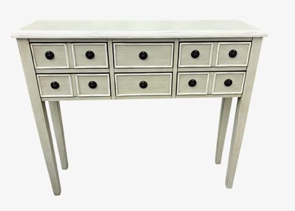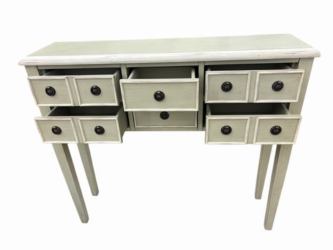 Gray-green console table w/ white outline & 6 drawers, 35" h, 40" w, 10" d