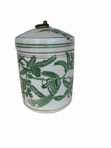 Green & White Cylinder Jar w/Brass Toggle Lid 5x7"