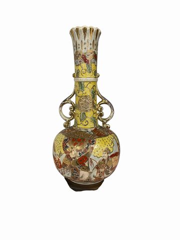 Hand Painted Japanese Kutari Yellow Vase w/Gold Handles 12x6"