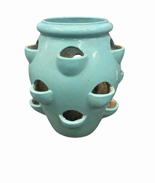 Galloway Large vintage turquoise strawberry pot on rolling metal stand, 17.5" h, 7.75" diam.