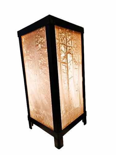 Metal Framed Bisque Glass, Forest Scenes Table Lamp 12"h x 6"sq