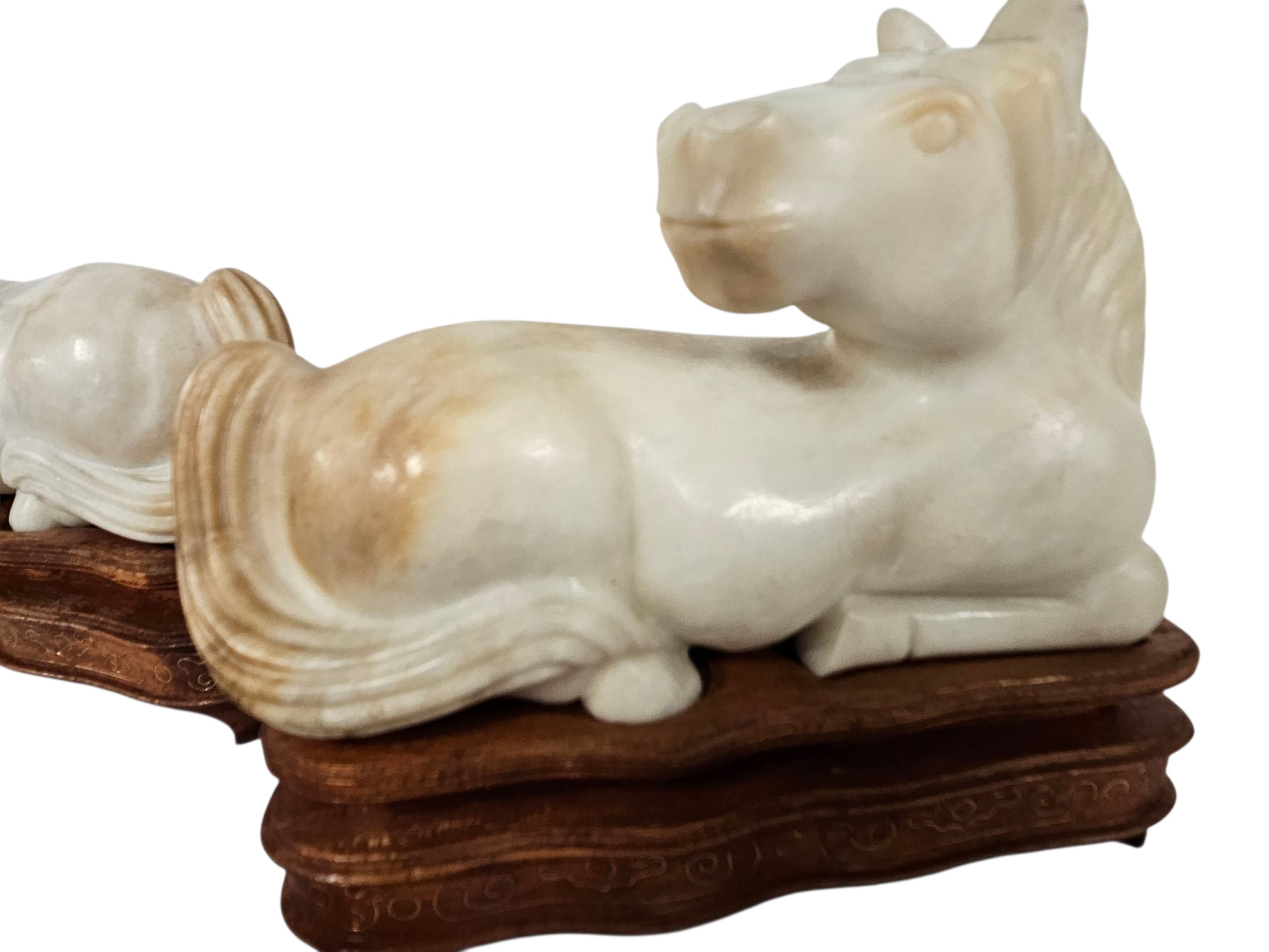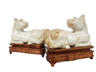 Pair Chinese Carved Marble Horses on Wood Stands 5"h x 5"l