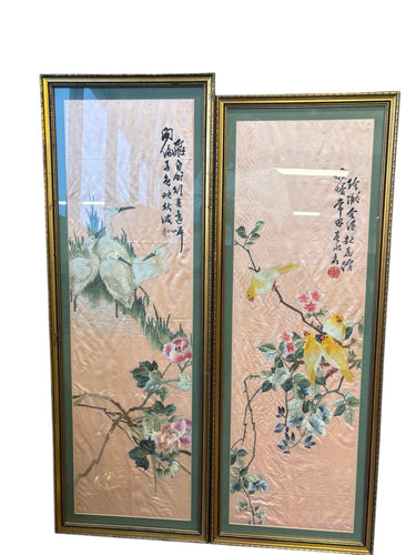 PAIR of antique Chinese framed silk embroidered panels, 41.5" h x 14.5" w & 40"