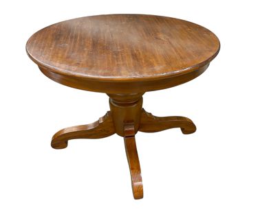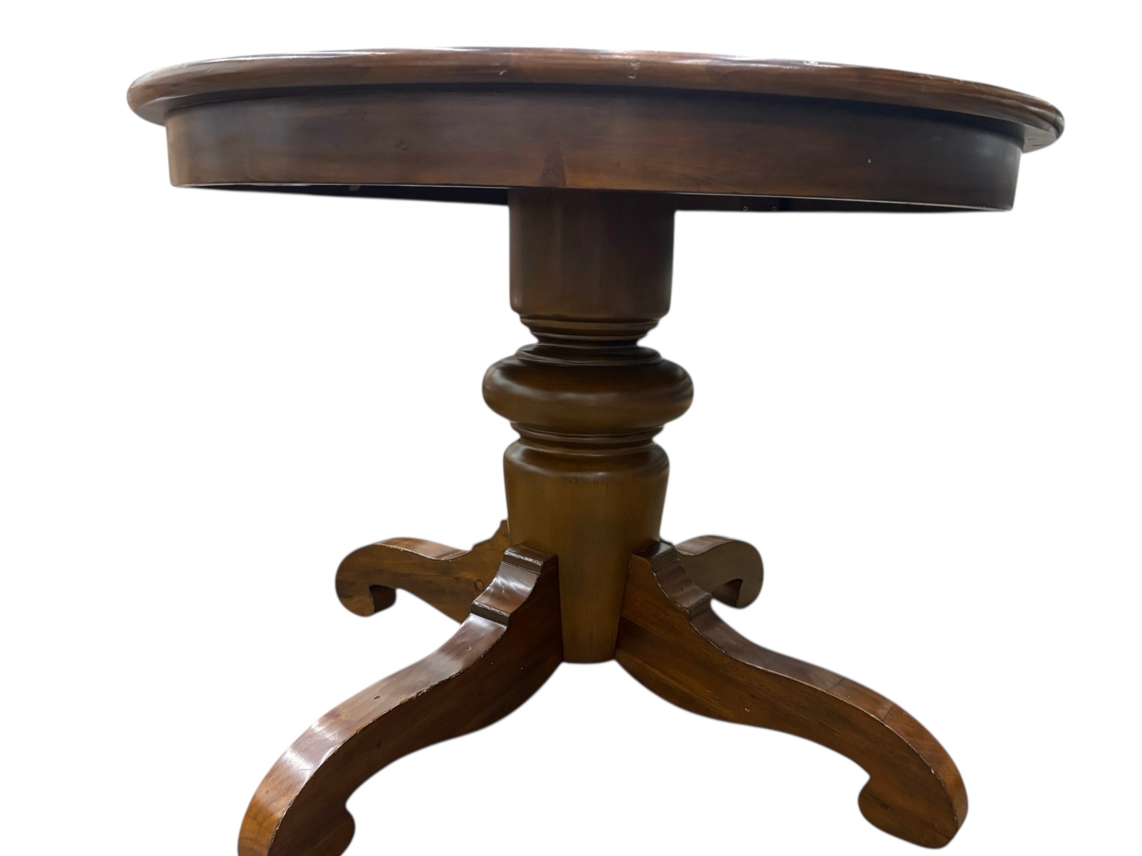 Round dark pine pedestal dining table w/ Empire-style legs, 30.25" h, 40" diam.