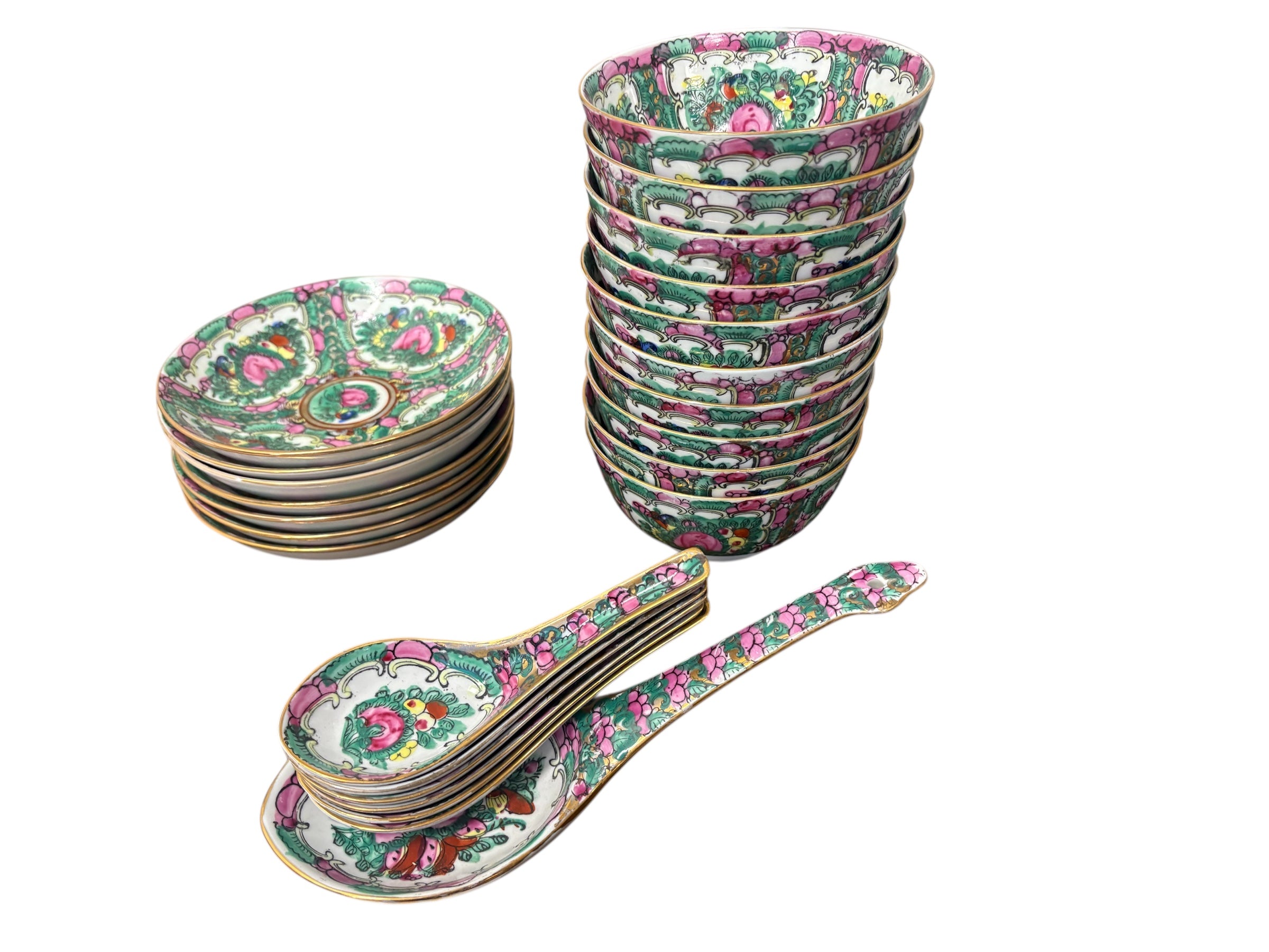 Set of 16 Set of 9 Chinese Famille Rose Medallion porcelain bowls + 7 ladles: 10 small, 4.5" diam., 6 shallow, 5.5" diam.