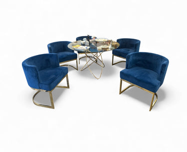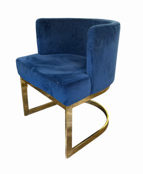 Set of 5 modern blue velvet barrel dining chairs on gold stainless steel frame,