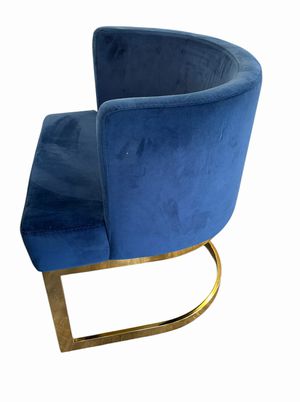 Set of 5 modern blue velvet barrel dining chairs on gold stainless steel frames, 29" h, 23.5" w, 19" d