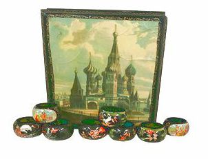 Set of 8 handpainted Russian lacquer napkin rings w/ storage box, 1.5" h, 7.5" w, 7.5" d