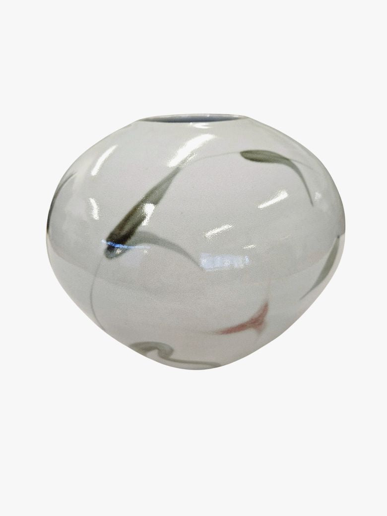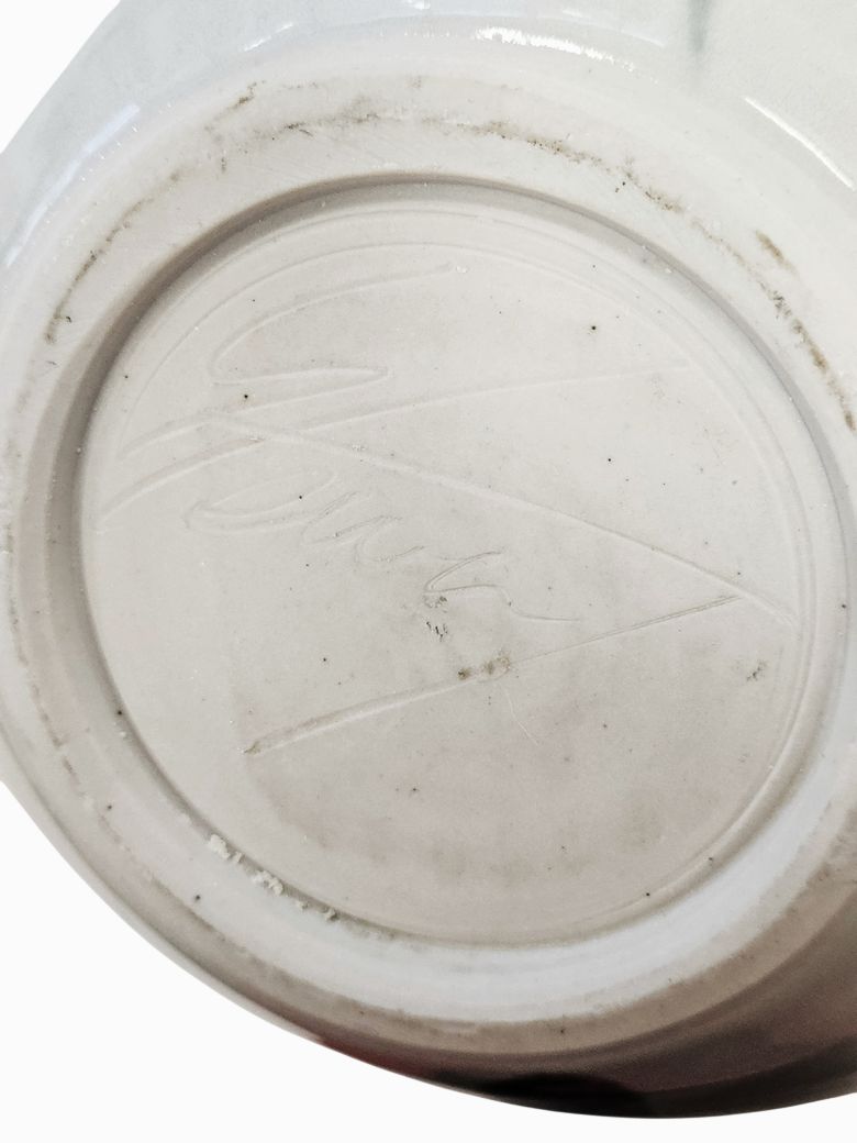 Signed Art Pottery Hand-thrown, Whit Asian abstract Floral 9"h x 9"w