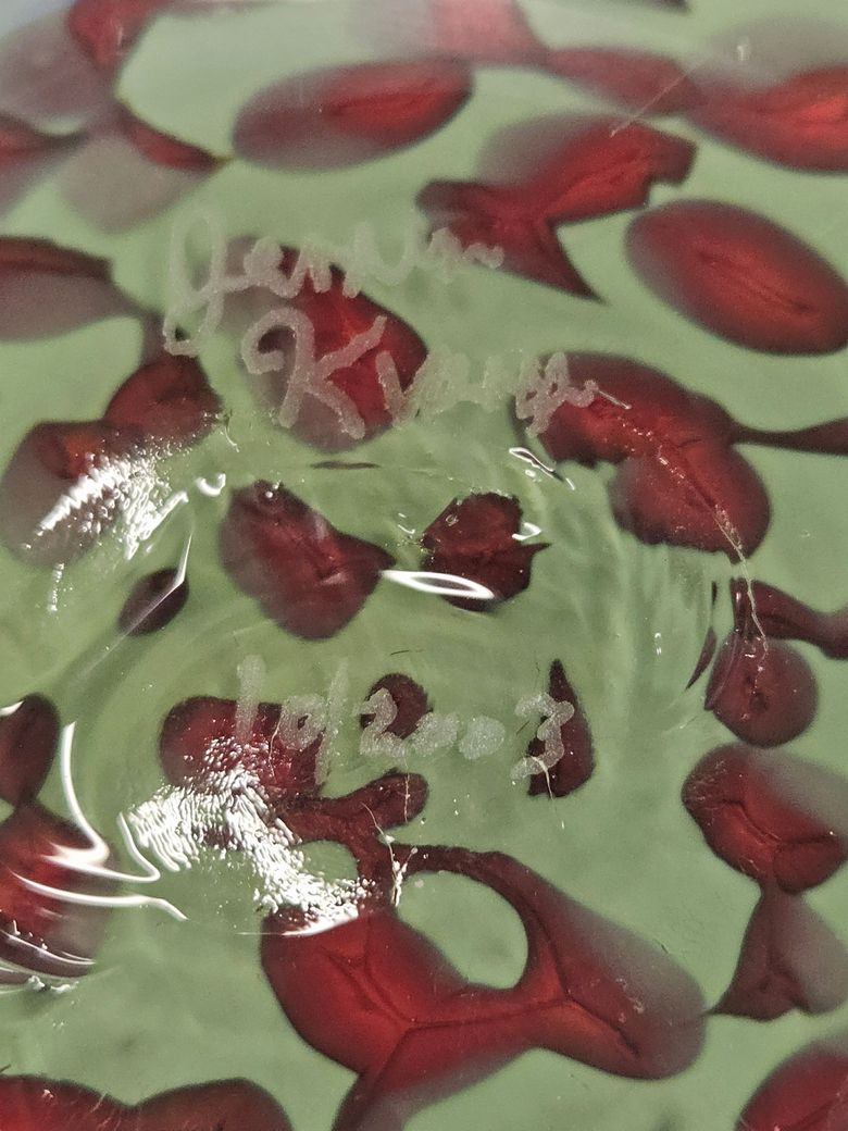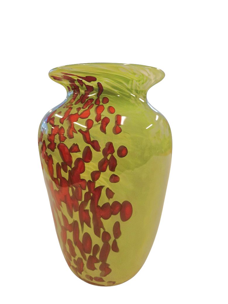 Signed Green Handblown Art Glass Vase with China-Red Splatter 9"x6"