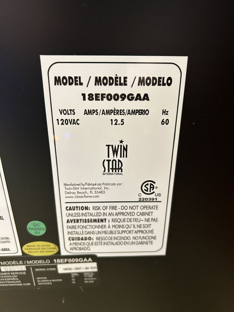 Twin Star ELECTRIC FIREPLACE, H. 34.5 in. x W. 34 in. x D. 13 in.