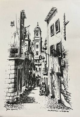 Unframed pen & ink repro. of Alfama district of Lisbon, 11.75" h 8.25" w