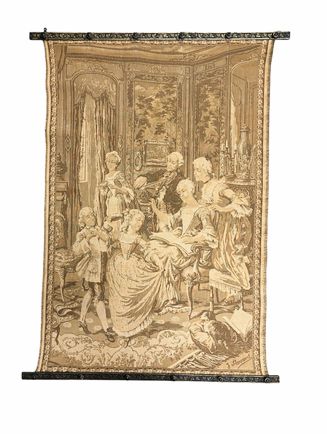 Vintage Belgian tapestry on antique brass hanging bars, signed J. Stevaert, ca. 1900, 44" l x 29" w