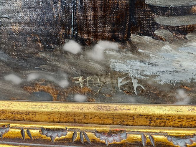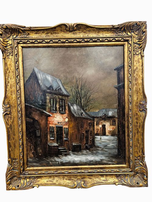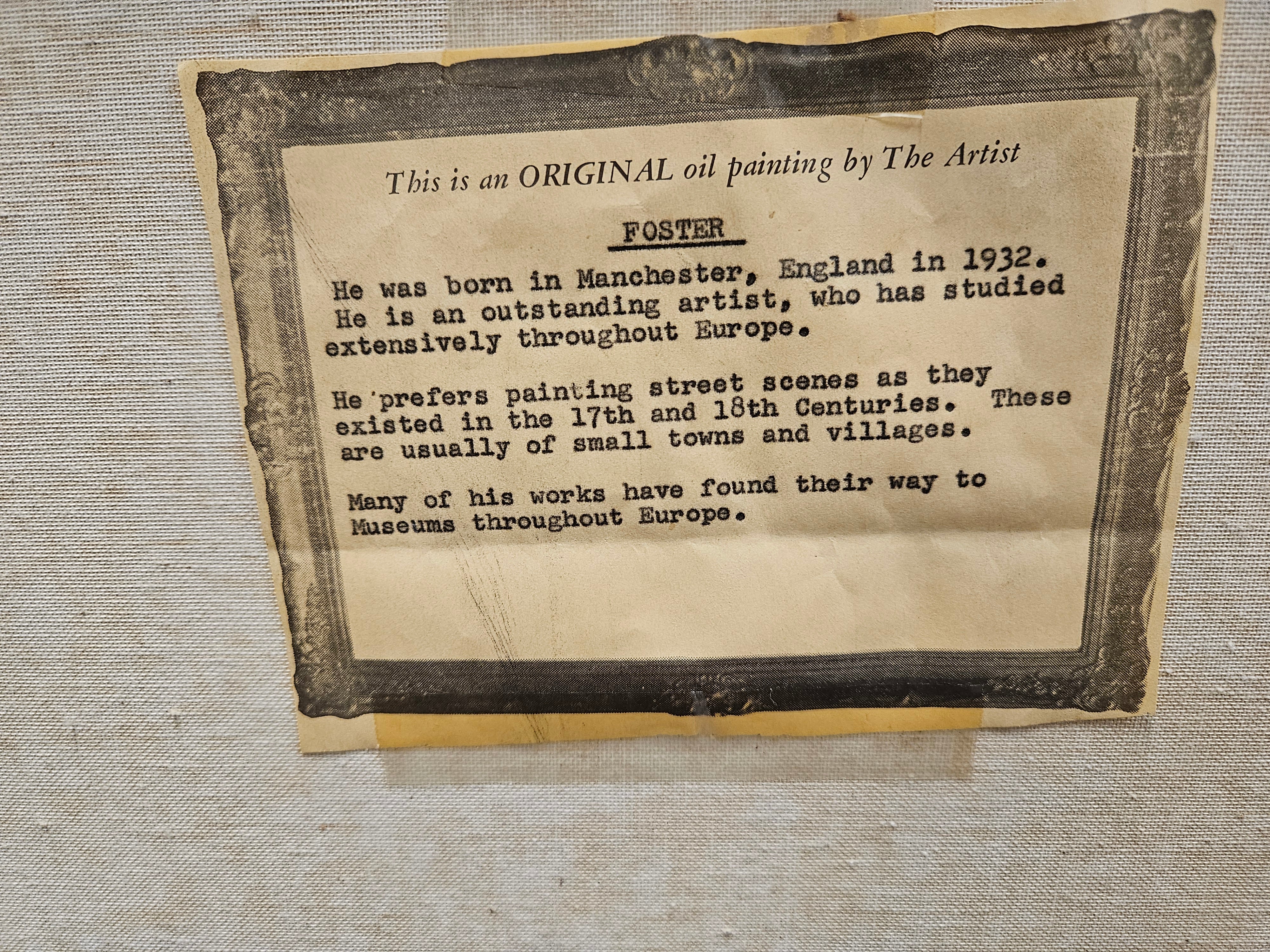 Vintage Oil Painting, signed Foster, Nightime Street Scene, Belgium 32'h x 28"w