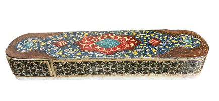 Vintage Persian Khatam micro-mosaic oblong wood pen case, 1.25" h, 8" w, 1.75" d