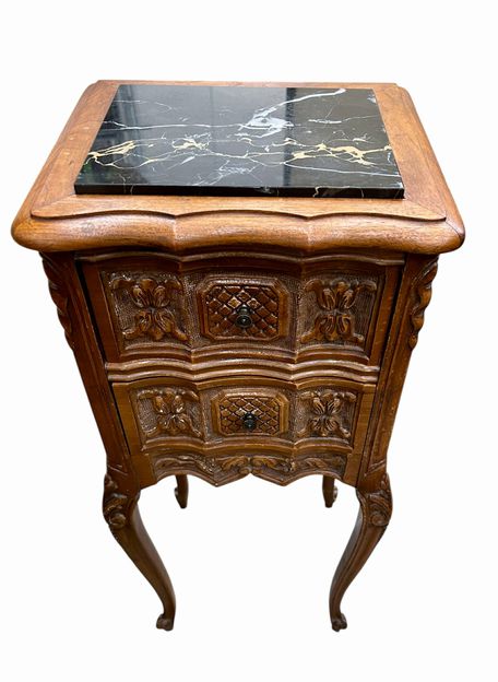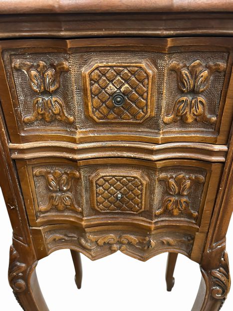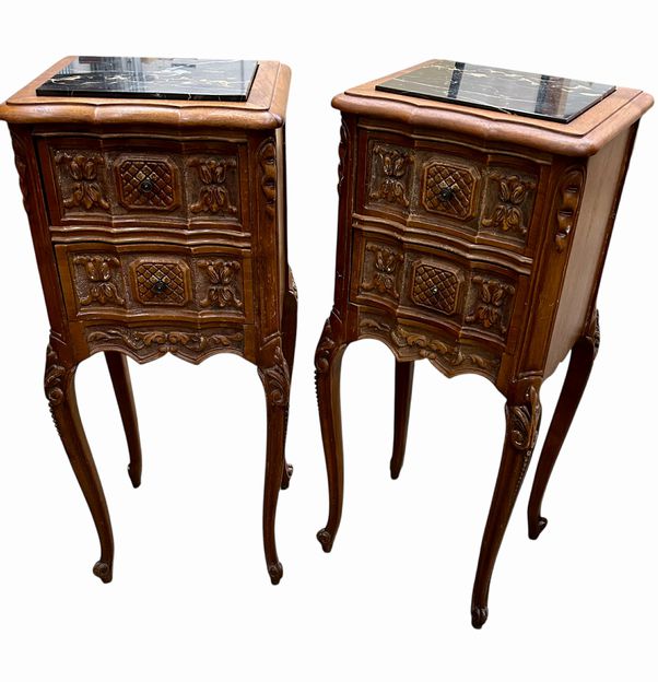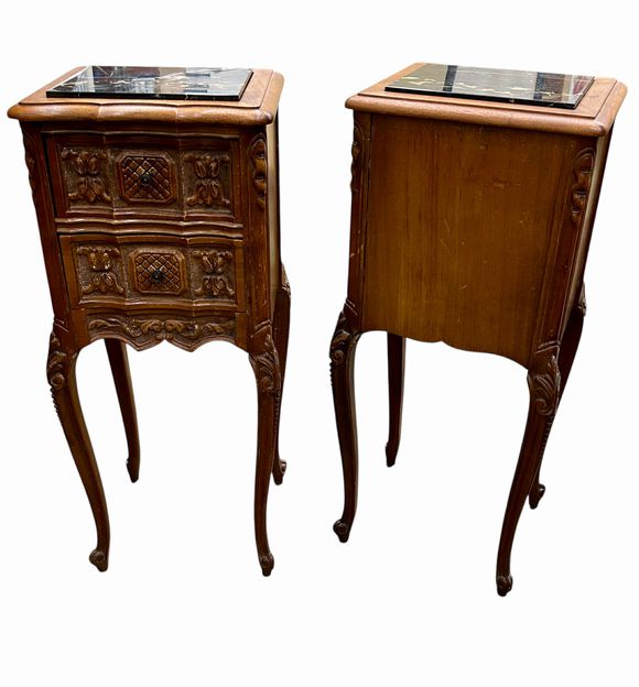 Pair Benck Furniture Louis XV Style Mahogany Side Tables w/Inserted Marble Tops, ca. 1930, H. 29.5 in. x W. 12.25 in. x D. 10.5 in. (one missing front pull)