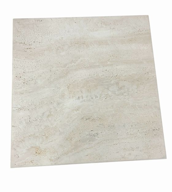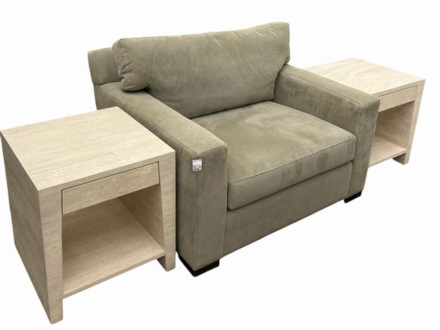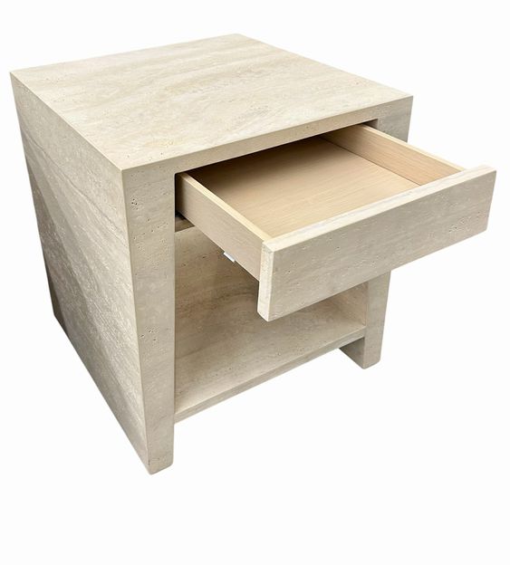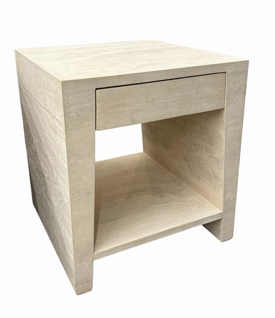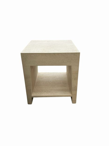 Pair Restoration Hardware Travertine Side Tables, H. 24 in. x W. 21 in.