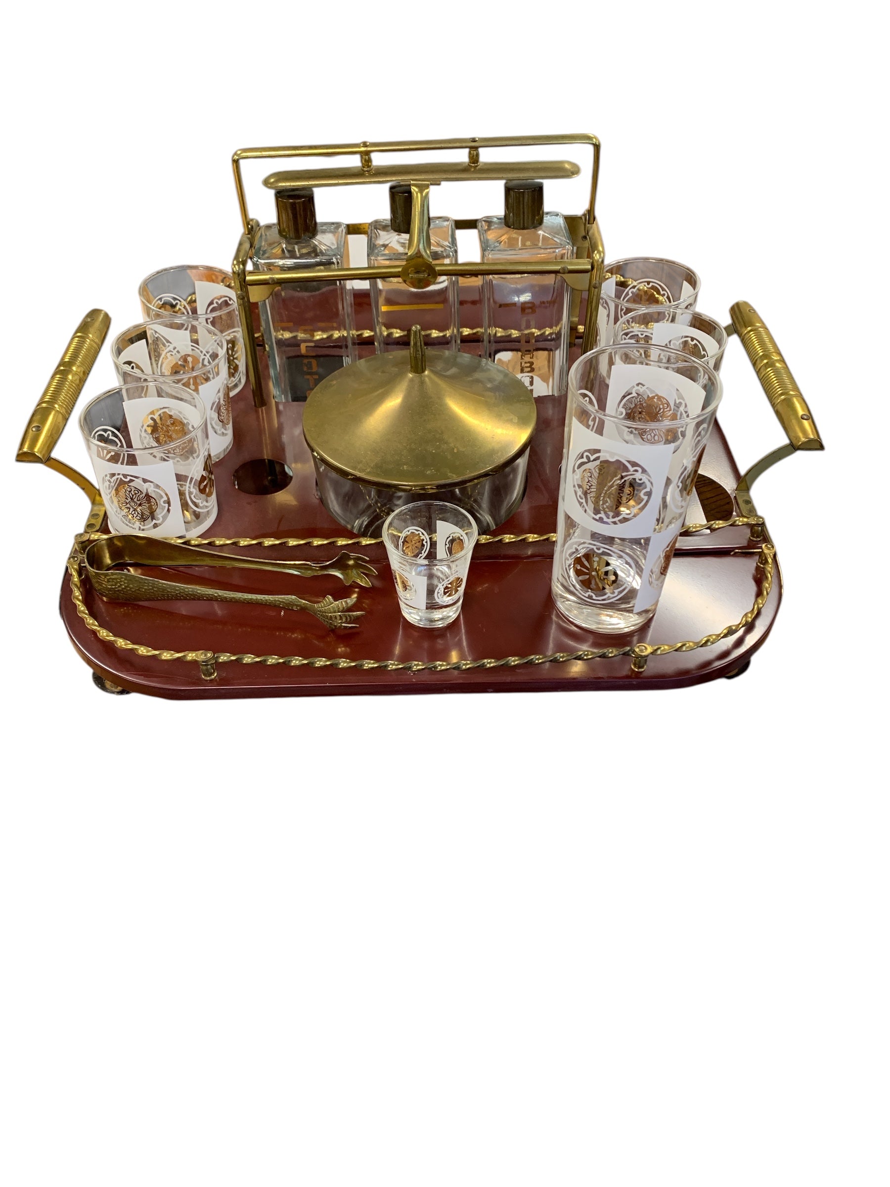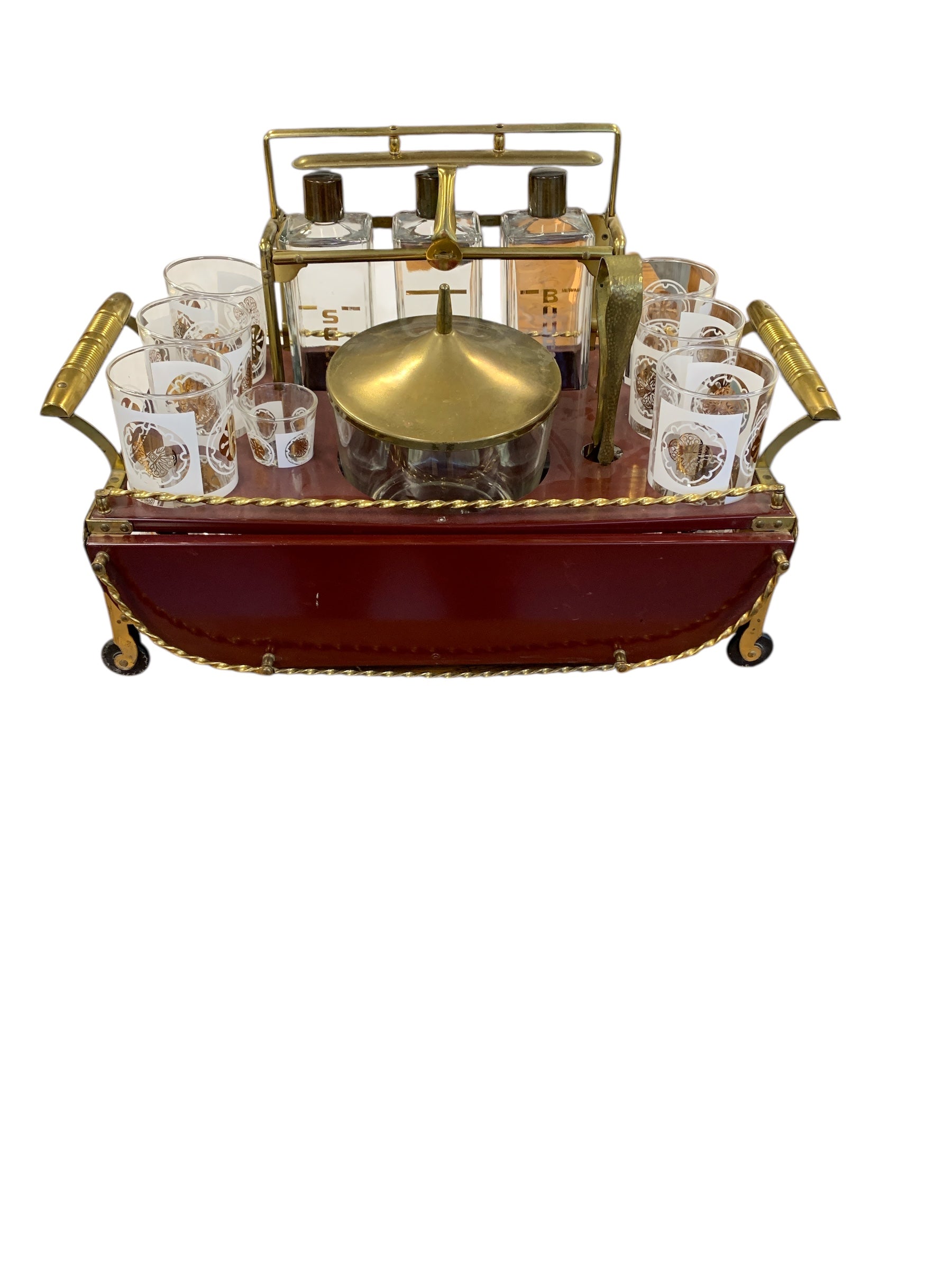 Vntg Portable bar, 6 glasses, 3 decanters, ice, 12"h x 20"' x 10"w