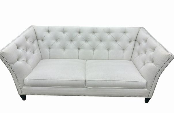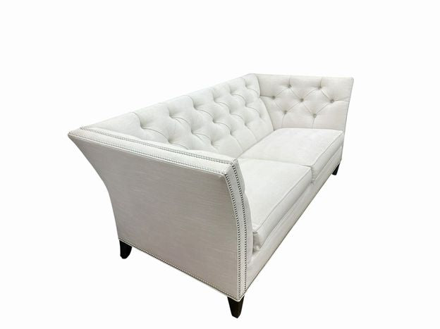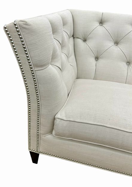 Keywords: Ethan Allen Shelton sofa, diamond tufted sofa, cream tufted sofa, nailhead trim sofa, Ethan Allen tufted couch, Hollywood Regency sofa, tufted fabric sofa, flared arm sofa, contemporary glam sofa, cream upholstered sofa, Ethan Allen Shelton cream, button tufted sofa, silver nailhead sofa, Ethan Allen custom sofa, transitional tufted sofa, ivory tufted loveseat, Ethan Allen living room, shelter arm sofa, high back tufted sofa, designer sofa secondhand