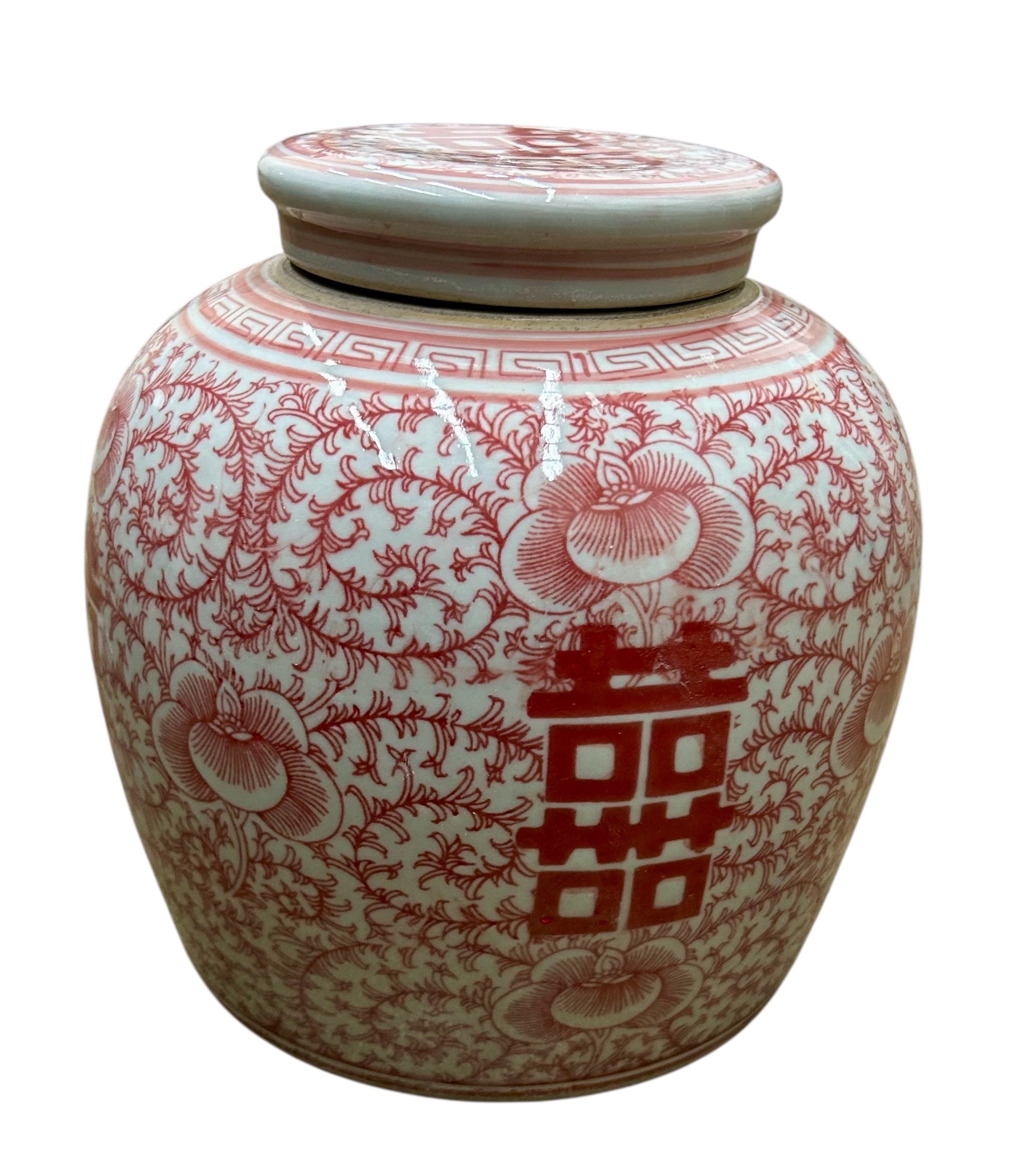 Chinese Red & White Double Happiness Round Lidded Jar, 9"x9"