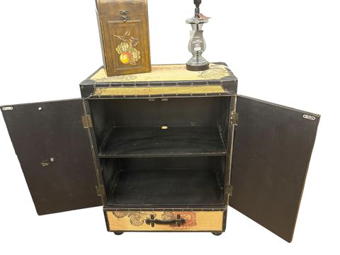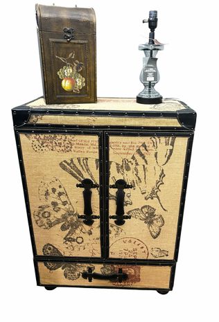 Grandin Road burlap storage cabinet w/ butterfly motif and black vinyl accents, 36" h, 26.25" w, 14" d
