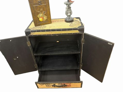 Grandin Road burlap storage cabinet w/ butterfly motif and black vinyl accents,