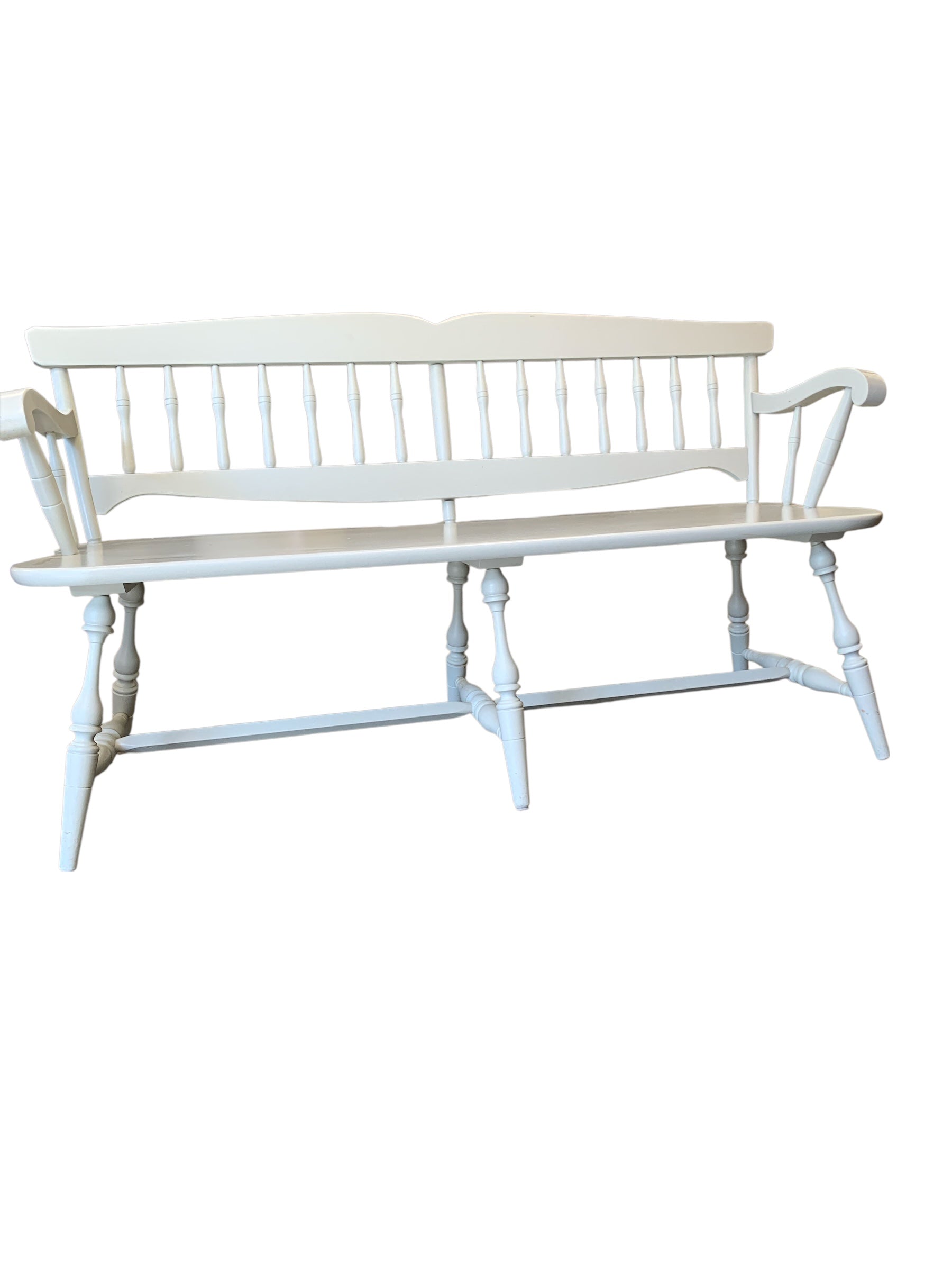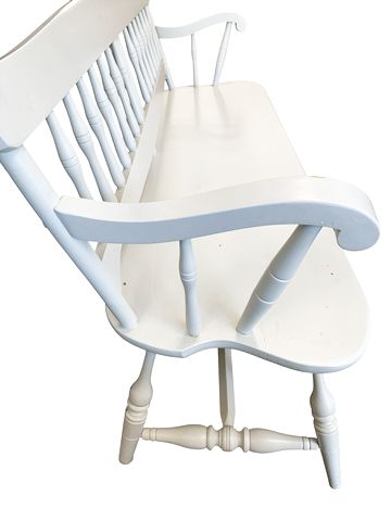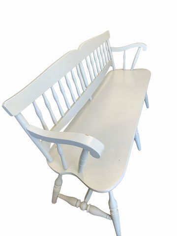 Keywords: deacon's bench, Windsor bench, spindle back bench, white farmhouse bench, painted wood bench, country bench, entryway bench, porch bench, Windsor settee, spindle back settee, farmhouse entryway, white painted bench, turned leg bench, American country furniture, cottage bench, Windsor style bench, long wooden bench, three-seat bench, white wood settee, AS IS bench