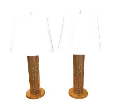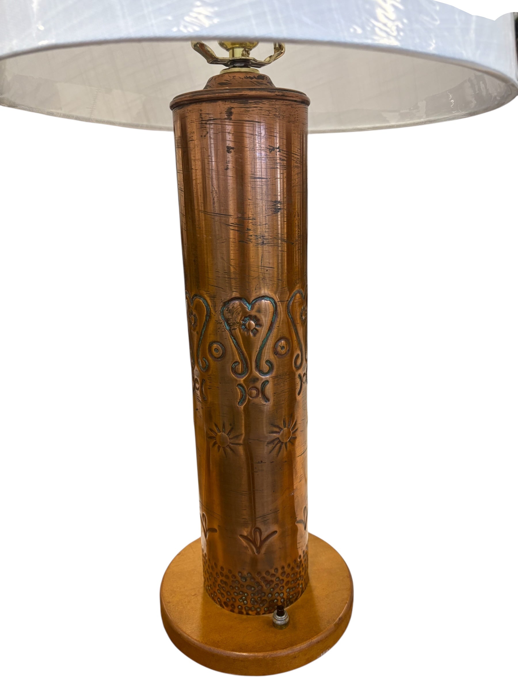 PAIR of MCM hand-crafted engraved tubular copper lamps w/ new white shades, 29"
