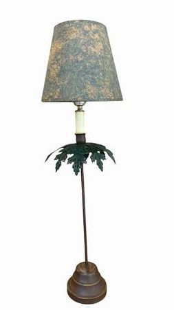 Rustic iron palm tree lamp w/ mottled green/gold shade, 28" h