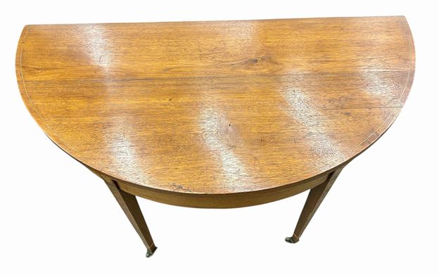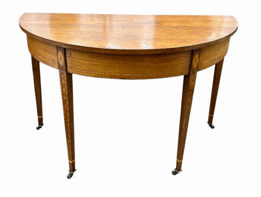 English George III Inlaid Mahogany Demi Lune (drop leaf missing) ca. 1780, H. 30.5 in. x W. 46.5 in. x D. 23 in.