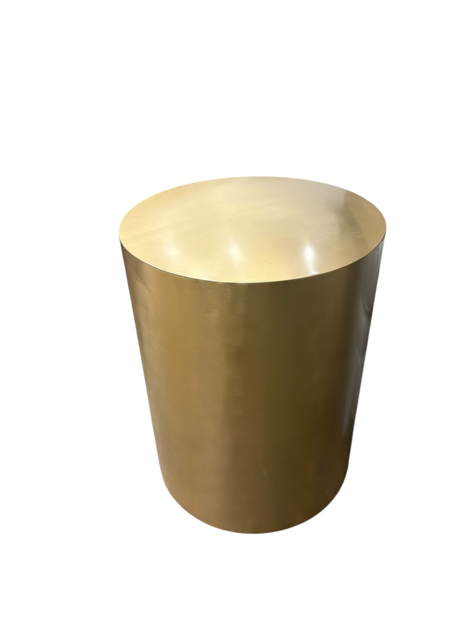 Round gold metal cylinder side table, 22.5" h, 17" diam.