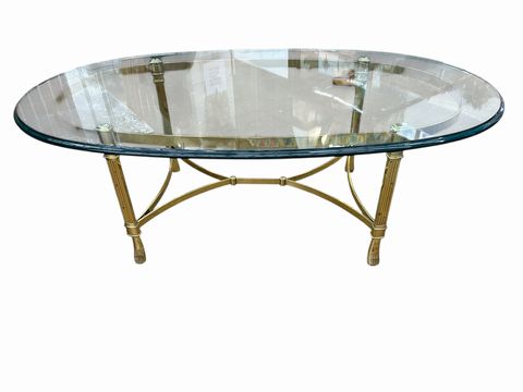 Vintage Glass & Brass Oval Cocktail Table, H. 16 in. x L. 46 in. x W. 26 in.