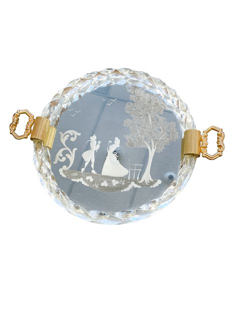 1940's Venetian Murano Mirrored Trinket Tray w Etched Image 11.5"Dia